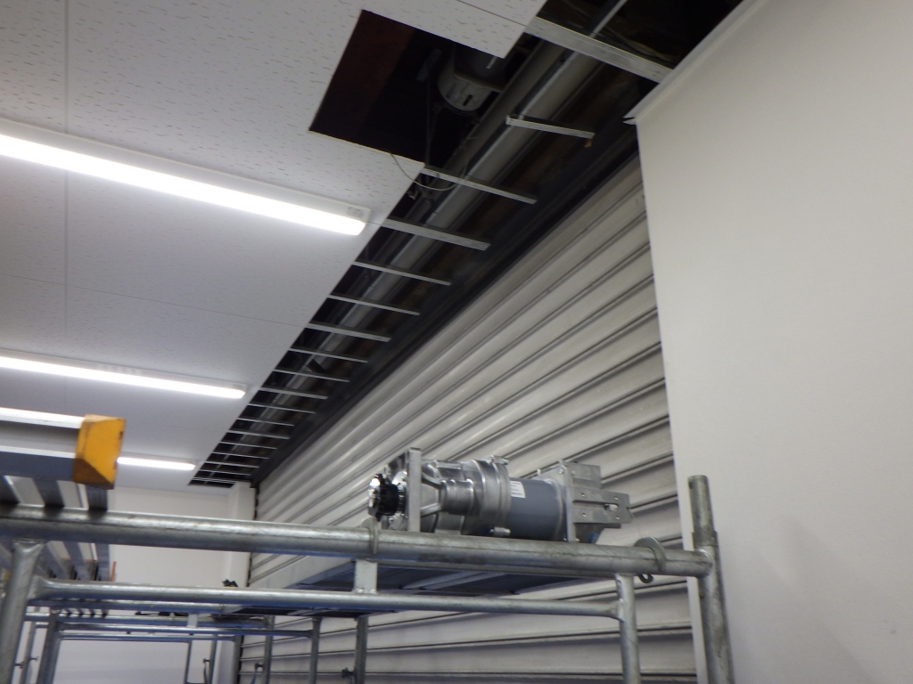 【重量シャッター修理(物挟み斜め)動かない電動部品更新・座板スイッチ増設】 ●開閉操作ガタガタバキバキ音が鳴り斜め(肩下がり)動かない不具合 ●天井内納まり点検口から巻きズレ吊り元外れ確認できました ●この状態危険です開閉操作禁止、チェーン操作禁止、...