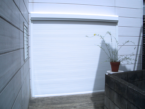 コンパクトなケースに納めたスラットは、すぐれた断熱効果を備えつつ、閉め たままでも通風と採光が可能。外観のスッキリとした印象とは異なり、機能性とデザイン性が両立した高品位窓シャッターです。この納まりは他になく電動土間納まり。